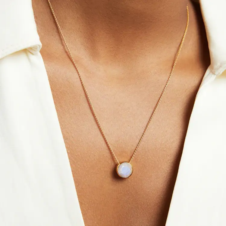 Featuring a multi-faceted, brilliant-cut rainbow moonstone gemstone, this pendant exudes a soft, ethereal glow that is perfect for day-to-night wear.