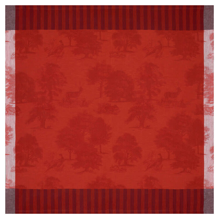 Our Souveraine collection will immerse you in the heart of a magical, enchanting forest. Let yourself be seduced by our 100% linen tablecloth and its panorama of greenery. This delicate tablecloth is like a toile de Jouy, where pheasants, wild boar, fawns and hares bask in the midst of luxuriant vegetation abounding in beauty. To complete this universe, you can opt for napkins from the same collection!