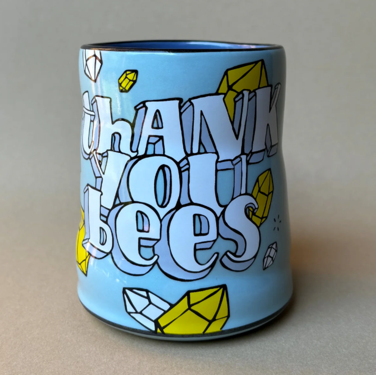 "My nephew, Wylie, is a beekeeper. Half of my profits from each Thank You Bee cup will go towards helping him create cover crops for the hives. This will create a summer ground where the bees are nestled between a small organic farm and fields of fireweed, buckwheat and clover. A happy bee feast. A feast that is pesticide free and thoughtfully created to help support one of this planet's national treasures- the honey bee!" -Cary