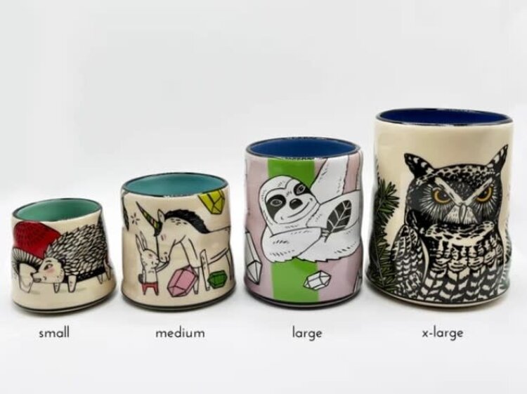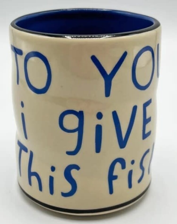 The Spark Cup Line is new from the Bowl Maker in 2022. The Spark Cups are Cary's painted poems upon a cup, with a bit of wonder and kindness stirred into the art for good measure. Just like prints of a painting, the cups that make up the Bowl Maker's Spark Cup line are faithful reproductions of Cary Lane's originals.-Text on cup says: "To you I give this fish"