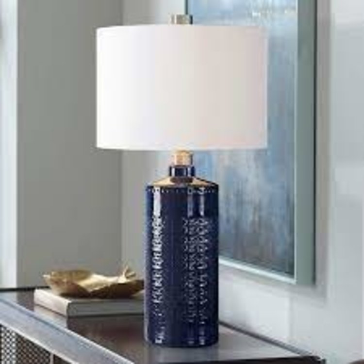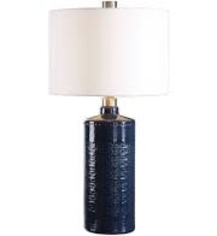 Intricately embossed ceramic finished in a royal blue glaze, accented with brushed nickel plated details. The round hardback drum shade is a white linen fabric with natural slubbing. *This item isn't covered by our shipping special, it is available for free pick-up in our West Seattle store. Please contact us directly if you wish to discuss possible shipping options or local delivery.