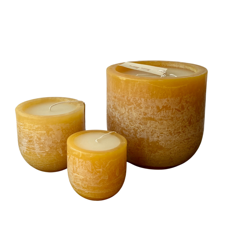 • This beautiful candle features a colored wax shell, and the mottled texture of the Timber collection gives it a wonderful look. Inside, the unscented wax burns nicely and gives off a lovely warm light as the shell glows.