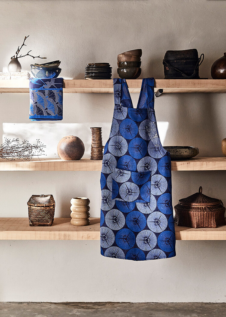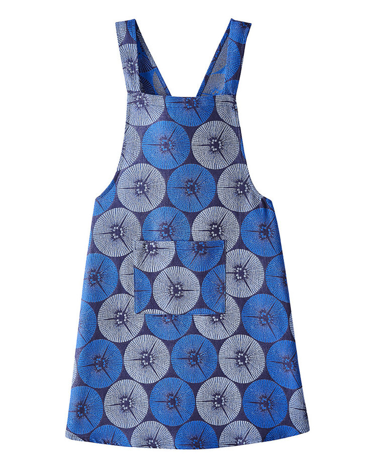 The apron, made of cotton and without any ties, is practical with its central pocket and can be put on quickly! In one size, 90x96cm, it has a narrow and feminine cut.